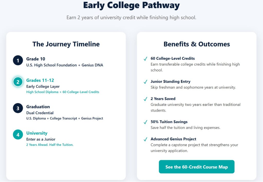 tuition. In today’s fast-changing world, getting ahead means more than just finishing high school. It means earning real college credits that count toward your bachelor’s degree while still in high school. Our program is designed for high-achieving students who want to fast-track their education, reduce costs, and gain a competitive edge.